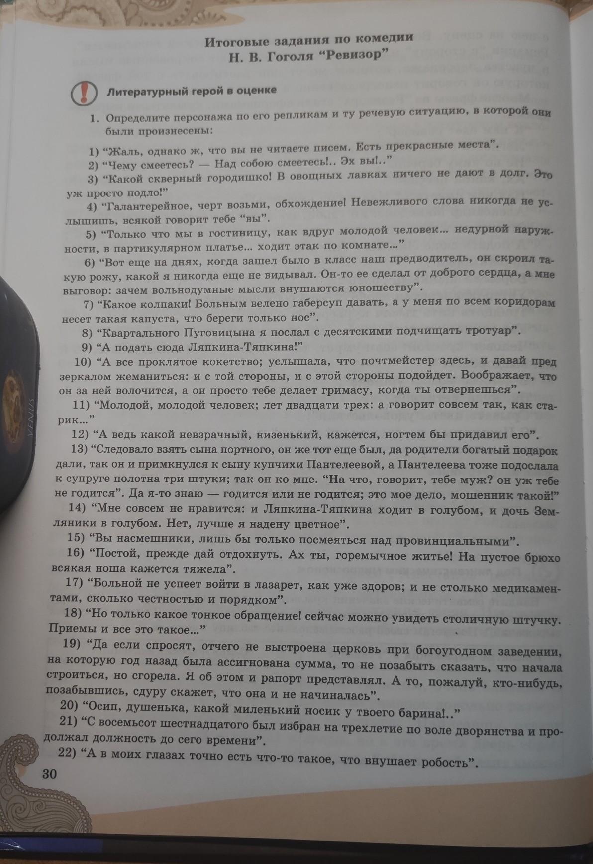 Литературный герой в оценке 1. Определите персонажа по его репликам и ту речевую ситуацию, в которой они были произнесены: 1) "Жаль, однако ж, что вы не читаете писем. Есть прекрасные места”. 2) "Чему смеетесь? Над собою смеетесь!.. Эх вы!.." 3) "Какой скверный городищко! В овощных лавках ничего не дают в долг. Это уж просто подло!" 4) “Галантерейное, черт возьми, обхождение! Невежливого слова никогда не ус- лышишь, всякой говорит тебе "вы". 5) "Только что мы в гостиницу, как вдруг молодой человек... недурной наруж- ности, в партикулярном платье... ходит этак по комнате..." 6) "Вот еще на днях, когда зашел было в класс наш предводитель, он скроил та- кую рожу, какой я никогда еще не видывал. Он-то ее сделал от доброго сердца, а мне выговор: зачем вольнодумные мысли внушаются юношеству”. 7) "Какое колпаки! Больным велено габерсуп давать, а у меня по всем коридорам несет такая капуста, что береги только нос". 8) "Квартального Пуговицына я послал с десятскими подчищать тротуар". 9) "А подать сюда Ляпкина-Тяпкина!" 1990) 10) "А все проклятое кокетство; услышала, что почтмейстер здесь, и давай пред зеркалом жеманиться: и с той стороны, и с этой стороны подойдет. Воображает, что он за ней волочится, а он просто тебе делает гримасу, когда ты отвернешься". 11) "Молодой, молодой человек; лет двадцати трех: а говорит совсем так, как ста- рик...” 12) "А ведь какой невзрачный, низенький, кажется, ногтем бы придавил его". 13) "Следовало взять сына портного, он же тот еще был, да родители богатый подарок дали, так он и примкнулся к сыну купчихи Пантелеевой, а Пантелеева тоже подослала к супруге полотна три штуки; так он ко мне. "На что, говорит, тебе муж, он уж теб не годится". Да я-то знаю — годится или не годится; это мое дело, мошенник такой! 14) "Мне совсем не нравится: и Ляпкина-Тяпкина ходит в голубом, и дочь Зем ляники в голубом. Нет, лучше я надену цветное". 15) "Вы насмешники, лишь бы только посмеяться над провинциальными". 16) "Постой, прежде дай отдохнуть. Ах ты, горемычное житье! На пустое брюх всякая ноша кажется тяжела". 17) "Больной не успеет войти в лазарет, как уже здоров; и не столько медикаме тами, сколько честностью и порядком”. 18) "Но только какое тонкое обращение! сейчас можно увидеть столичную штучк Приемы и все это такое... "" 19) "Да если спросят, отчего не выстроена церковь при богоугодном заведени на которую год назад была ассигнована сумма, то не позабыть сказать, что нача строиться, но сгорела. Я об этом и рапорт представлял. А то, пожалуй, кто-нибу. позабывшись, сдуру скажет, что она и не начиналась". 20) “Осип, душенька, какой миленький носик у твоего барина!.." 21) "С восемьсот шестнадцатого был избран на трехлетие по воле дворянства и п должал должность до сего времени". 22) "А в моих глазах точно есть что-то такое что в