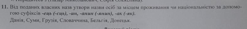 Данія-данець,данка. Суми-сумчанин,сумчанка. Грузія -грузин,грузинка. Словаччина -словак,словачка. Бельгія -бельгієць, бельгійка. Донецьк -донеччанин, донеччанка.