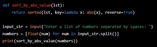 n действительных чисел одной строкой через пробел. Нужно написать программу, которая сортирует список чисел по убыванию их абсолютного значения.