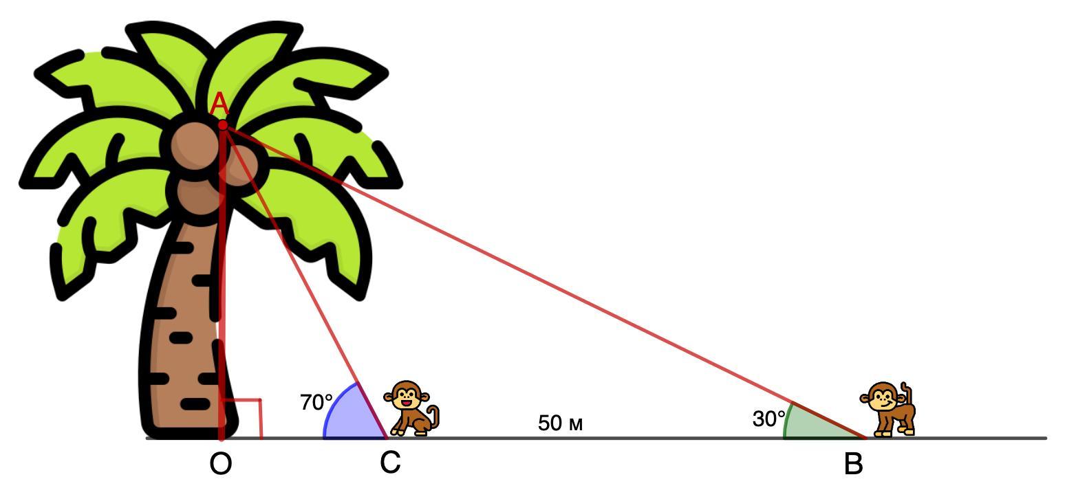 Обезьяна идет по ровной земле к кокосовому дереву, на верхушке которого она видит вкусные кокосы. Угол возвышения кокосов над обезьяной составляет 30°, а после того, как обезьяна продвинулась к дереву на 50 м, угол возвышения увеличился до 70°. На какой высоте над землей находятся кокосы?