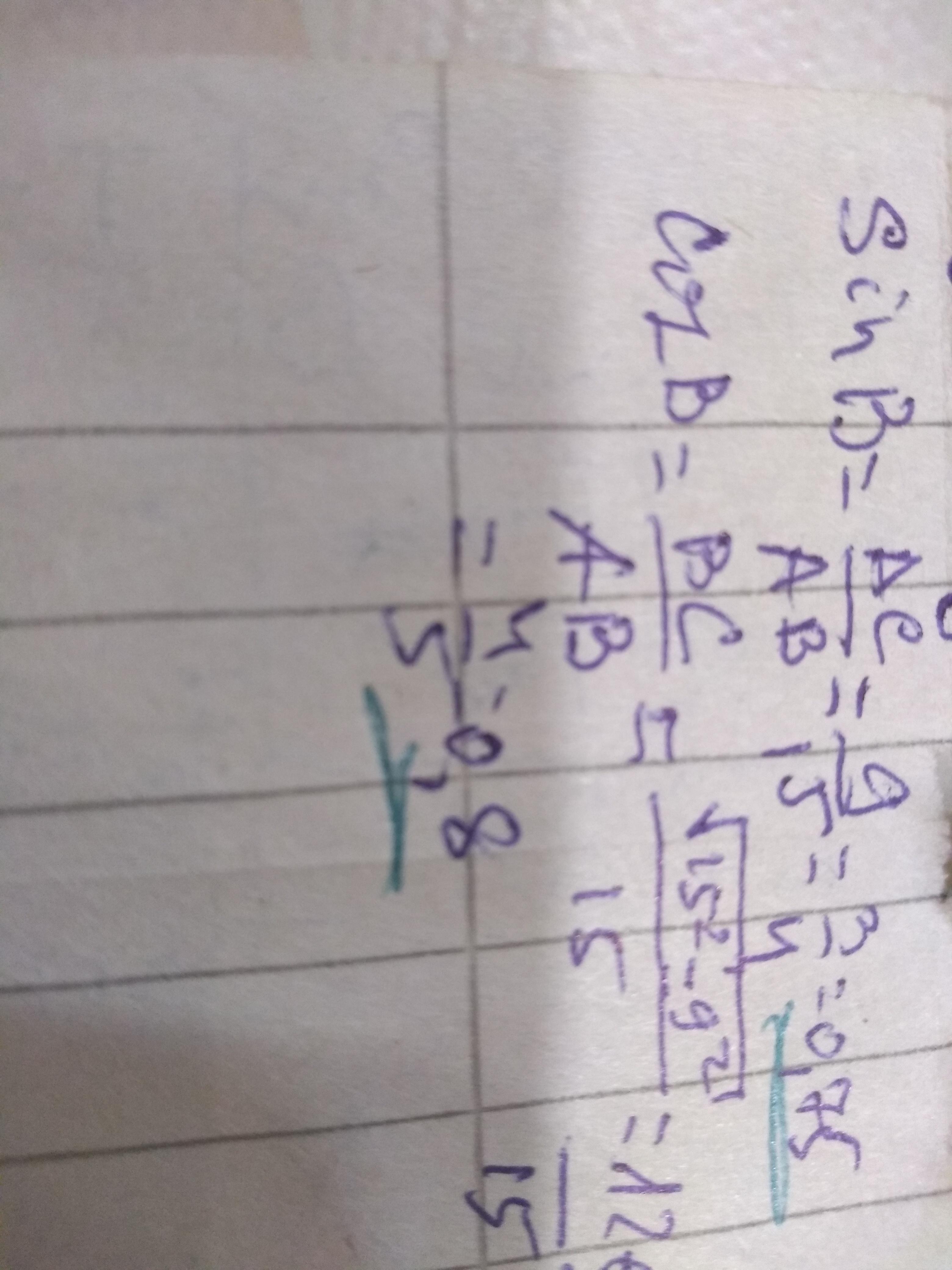 Из точки А к прямой проведен наклон AB= 15 см и перпендикуляр АС = 9 см. Найдите синус и косинус: угла В.