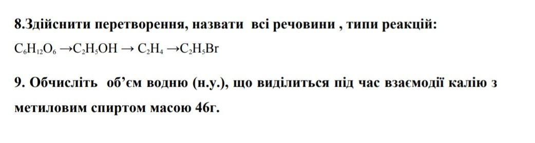 8.Здійснити перетворення, назвати всі речовини , типи реакцій: C6H12O6 —> C2H5OH —> C2H4 —> C2H5Br