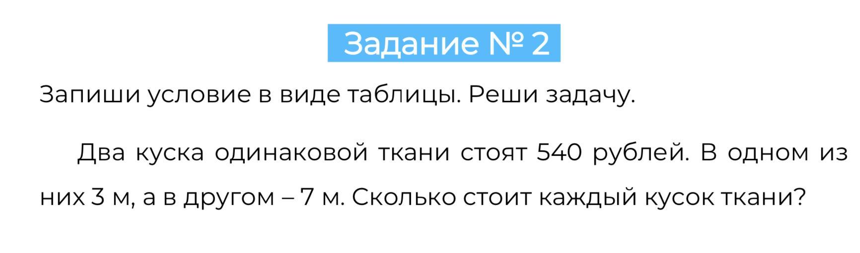 Два куска одинаковой ткани стоят 540 рублей. В одном из них 3 м, а в другом – 7 м. Сколько стоит каждый кусок ткани? Пожалуйста кто-нибудь помогите иначе мама мне удали на пол года для меня очень важную игру