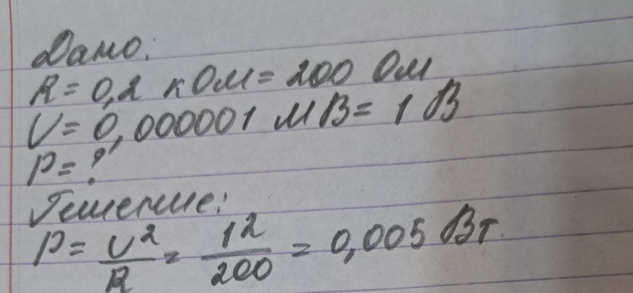 Найдите мощность электрического тока в лампе, если сопротивление нити накаливания лампы 0,2 кОм, а напряжение на нити 0,000001 МВ.