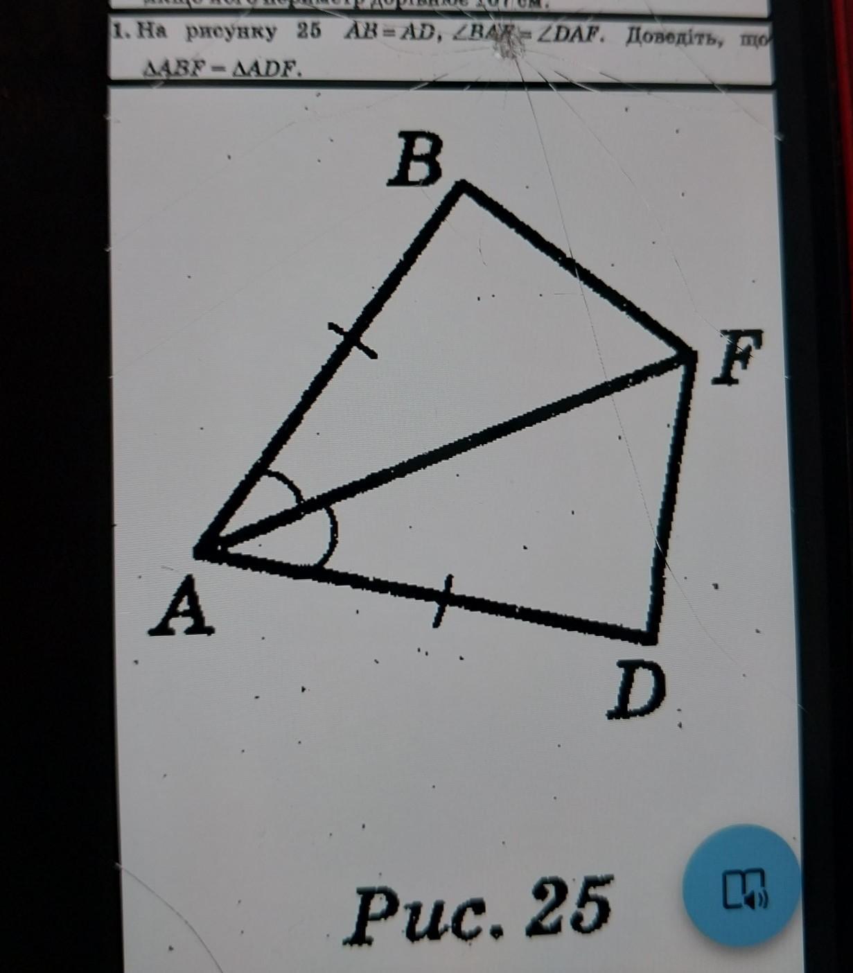 На рисунку 25 АВ=AD, <BAF=<DAF. Доведіть, що трикутник АBF= трикутнику ADF