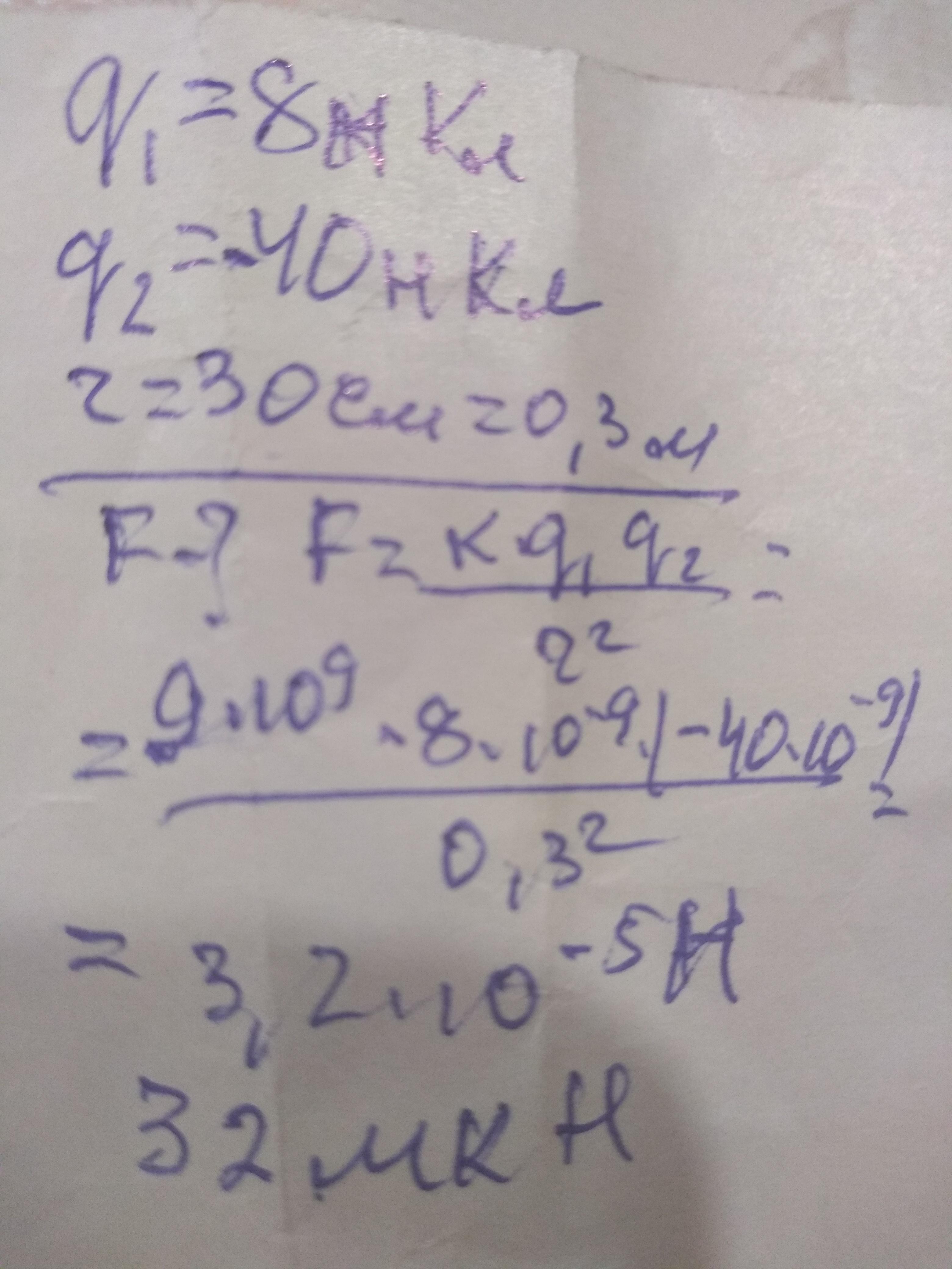 Обчисліть силу взаємодії між двома кульками, що мають заряди +8нКл та -40нКл, якщо відстань між ними 30 см