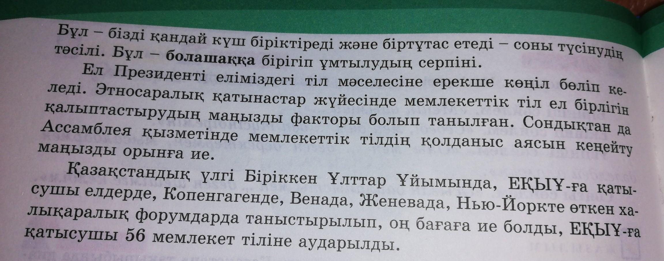 6-тапсырма. Мәтіндегі ақпаратты «Төрт сөйлем» тәсілін пайдаланып айт. Пікір. Оқыған мәтін бойынша ез пiкiрiндi бiр сейлеммен жаз. Дәлел. Өз пiкiрiндi бiр сейлеммен дәлелде. Мысал. Пікірiндi әмірмен байланыстырып, мысал келтір. Қорытынды. Тақырып бойынша қорытынды жаз.