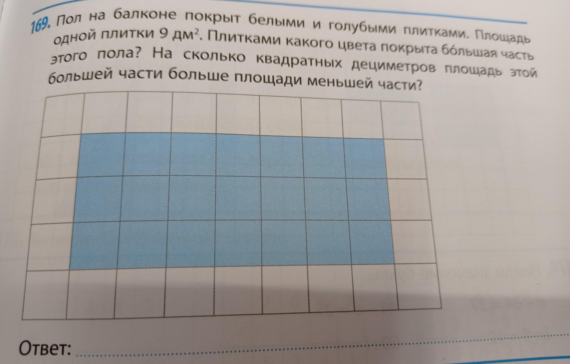 169. Пол на балконе покрыт белыми и голубыми плитками. Площадь одной плитки 9 дм². Плитками какого цвета покрыта большая часть этого пола? На сколько квадратных дециметров площадь этой большей части больше площади меньшей части? Ответ: