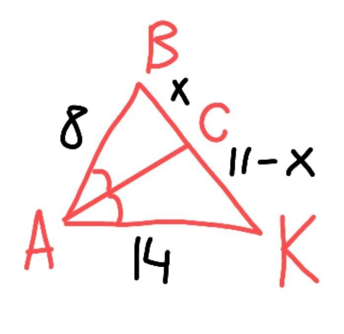 №1 Відрізок АС – бісектриса трикутника ABK. Знайдіть ВС та СК, якщо AB=8 см, ВК=11 см, АК = 14 см.