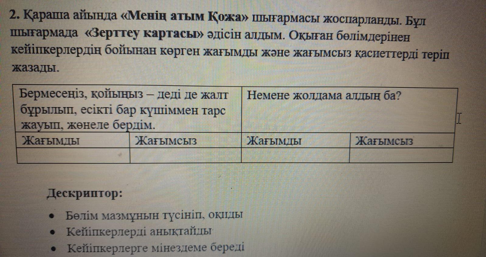 2. Қараша айында «Менің атым Қожа» шығармасы жоспарланды. Бұл шыгармада «Зерттеу картасы» әдісін алдым. Оқыған бөлімдерінен кейіпкерлердің бойынан керген жагымды және жағымсыз касиеттерді теріп жазады. Бермесенiз, койыныз - деді де жалт Немене жолдама алдын ба? бұрылып, есікті бар күшіммен тарс жауып, женеле бердім. Жағымды Жағымсыз Дескриптор: Бөлім мазмұнын тусiнiп, окиды • Кейіпкерлерді аныктайды • Кейiпкерлерге мiнездеме береді Жағымды Жағымсыз комек