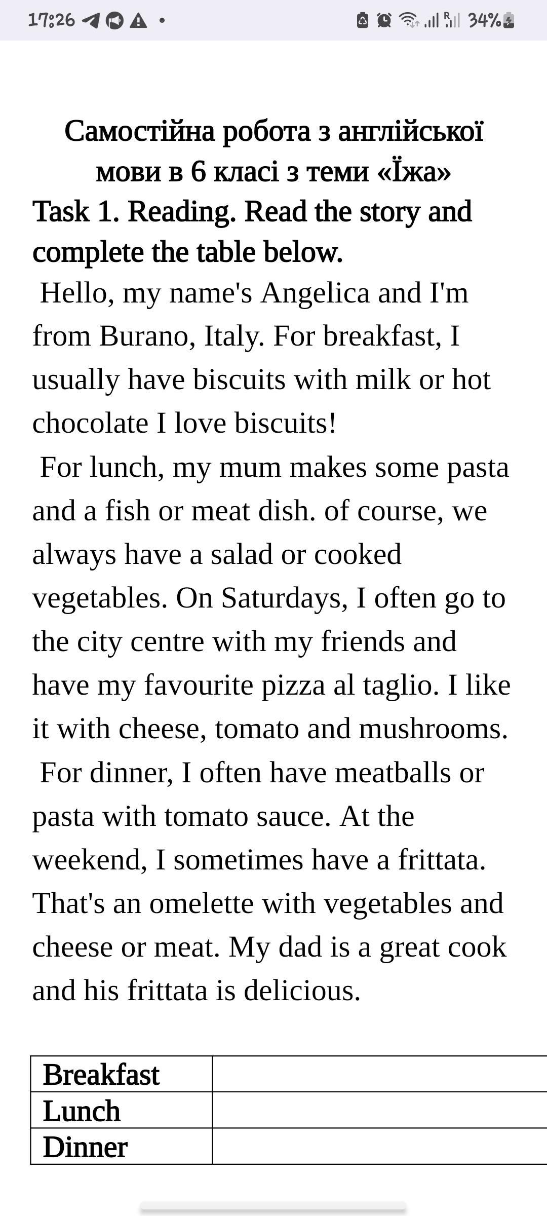 Dinner: meatballs, pasta with tomato sauce, frittata(omelette).