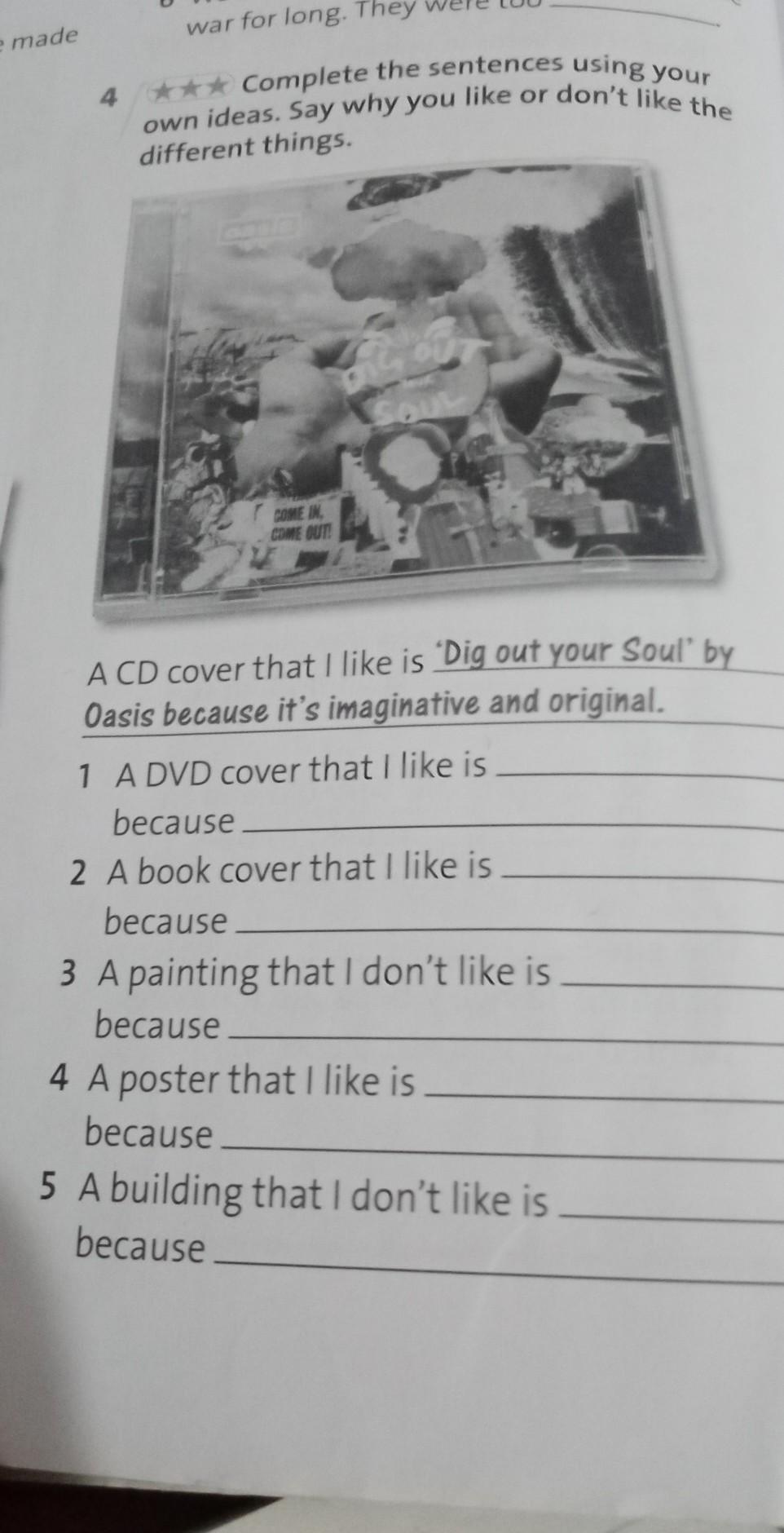 Complete the sentence using your own ideas.Say why you like or don't like the different things.A CD cover that I like is 'dig