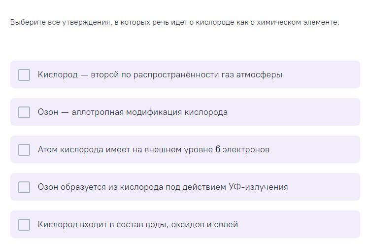 Выберите все утверждения, в которых речь идет о кислороде как о химическом элементе.