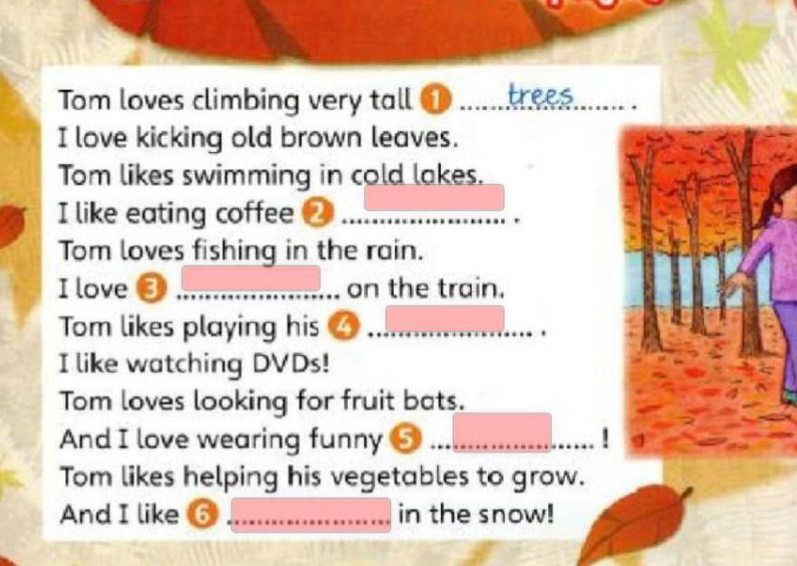 treeshatstravellingcakesCDsplaying Tom loves climbing very tall I love kicking old brown leaves. Tom likes swimming in cold lakes. I like eating coffee 2.... Tom loves fishing in the rain. I love 3 .................. on the train. Tom likes playing his 4 ....... I like watching DVDs! trees. Tom loves looking for fruit bats. ..........! And I love wearing funny .... Tom likes helping his vegetables to grow. And I like 6....... in the snow! даю 15 баллов