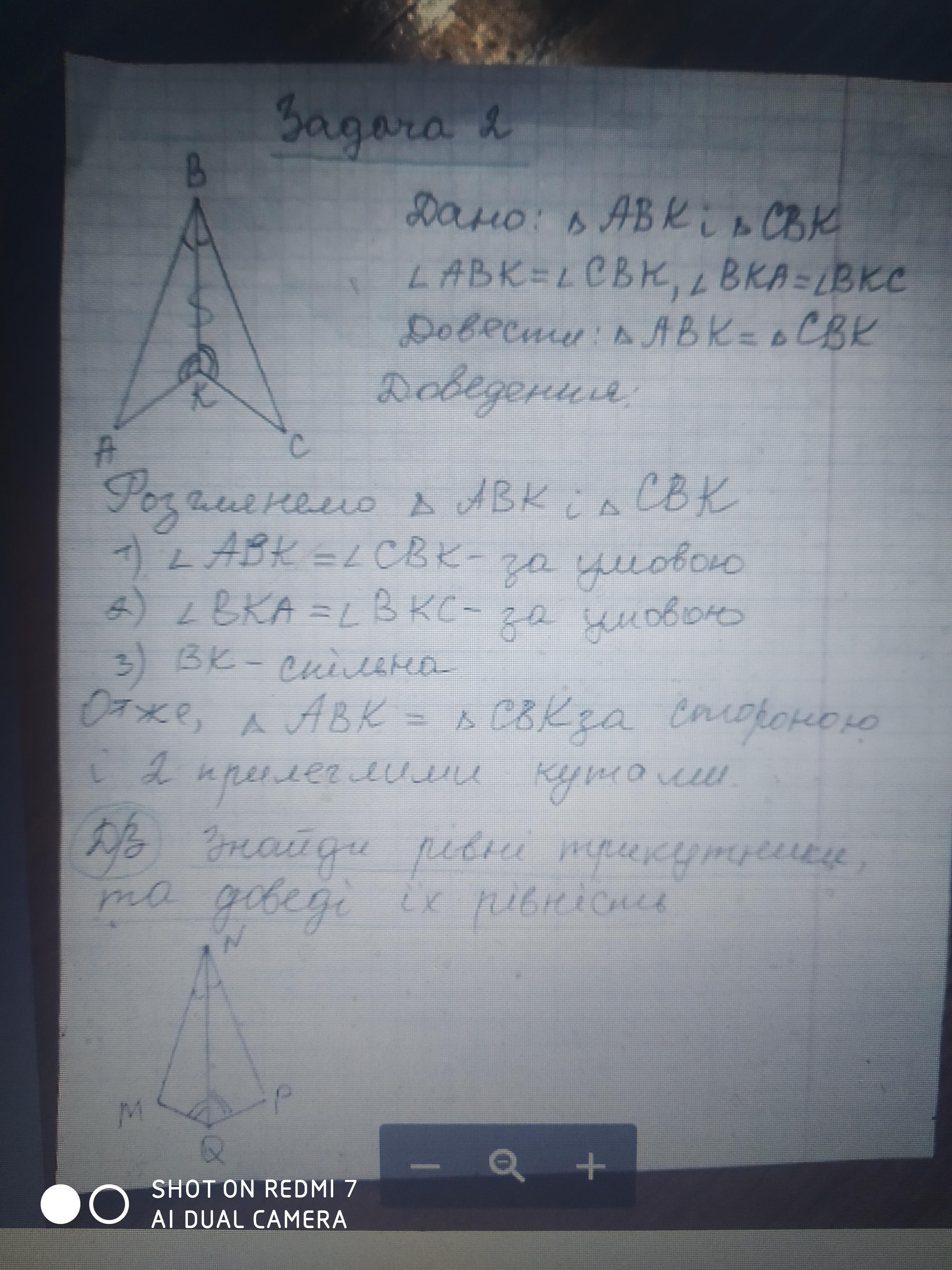 MNQ=PNQ за стороною NQ ( вона спільна), і рівними за умовою кутами PNQ=MNQ, PQN=MQN, отже, трикутники рівні за другою ознакою