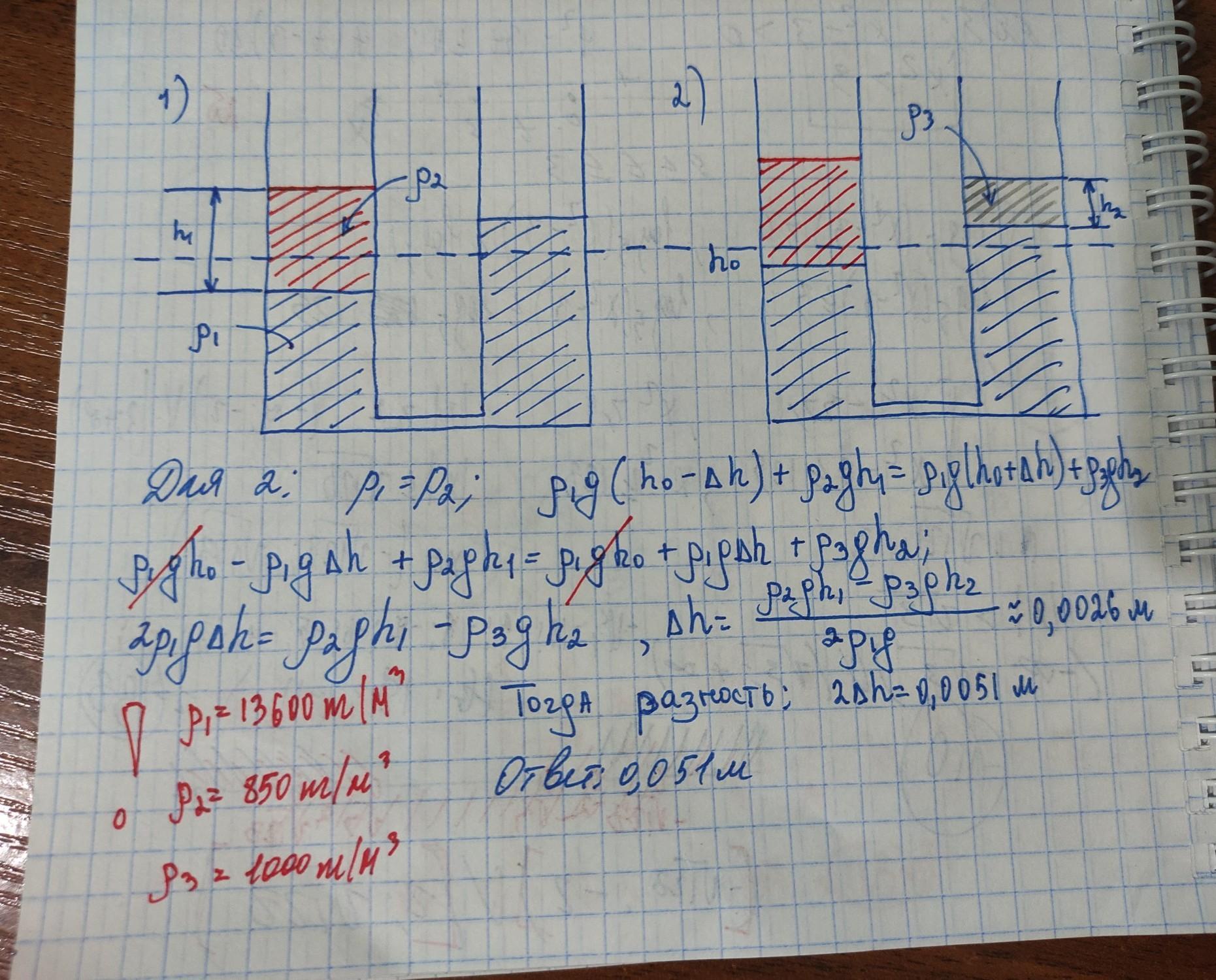в u-подібну трубку налили ртуть. потім в одне коліно трубки налили шар гасу висотою 20 см а в друге - воду висота стовпа якої 10 см. визнач різницю рівнів ртуті в обох колінах уважай що після долиття поверхні.