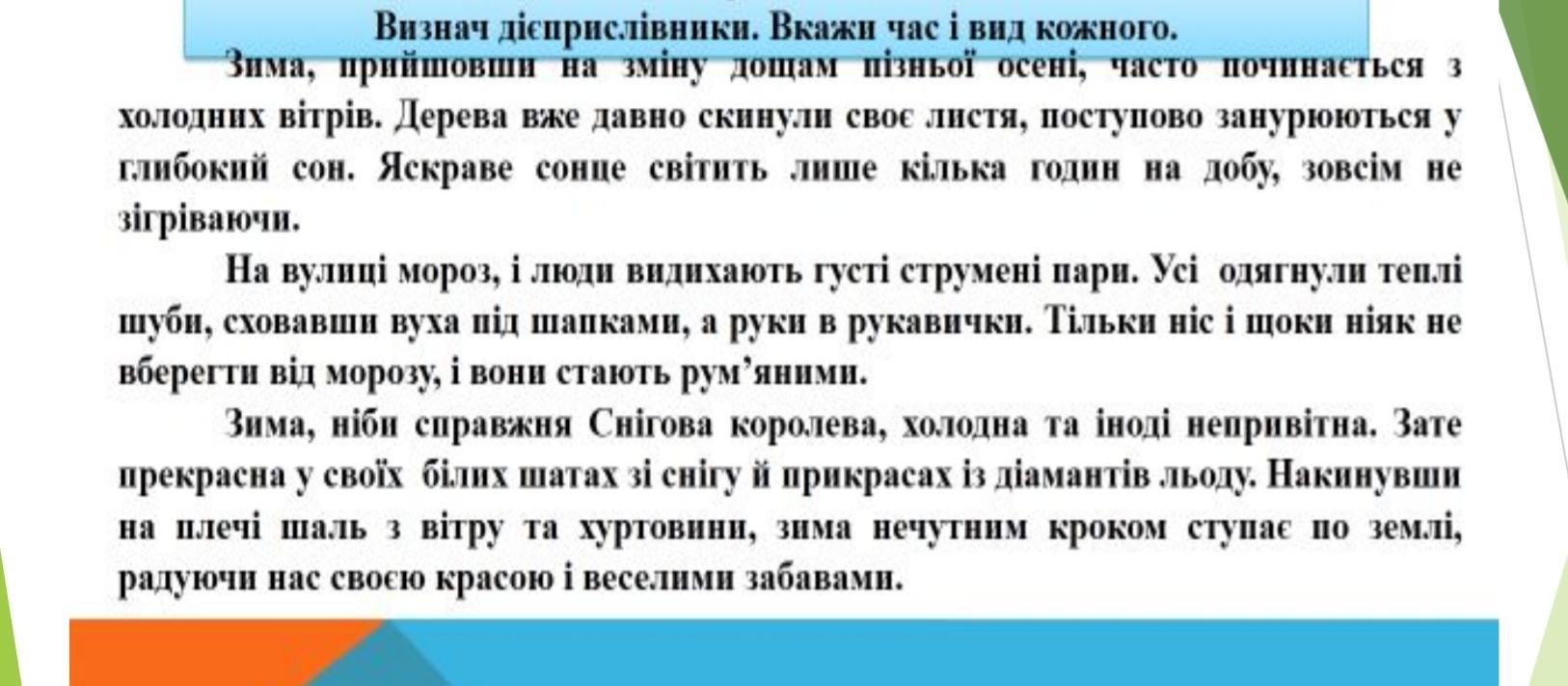 Визнач дієприслівники. Вкажи час і вид кожного. Зима, прийшовши на зміну дощам пізньої осені, часто починається з холодних вітрів. Дерева вже давно скинули своє листя, поступово занурюються у глибокий сон. Яскраве сонце світить лише кілька годин на добу, зовсім не зігріваючи.