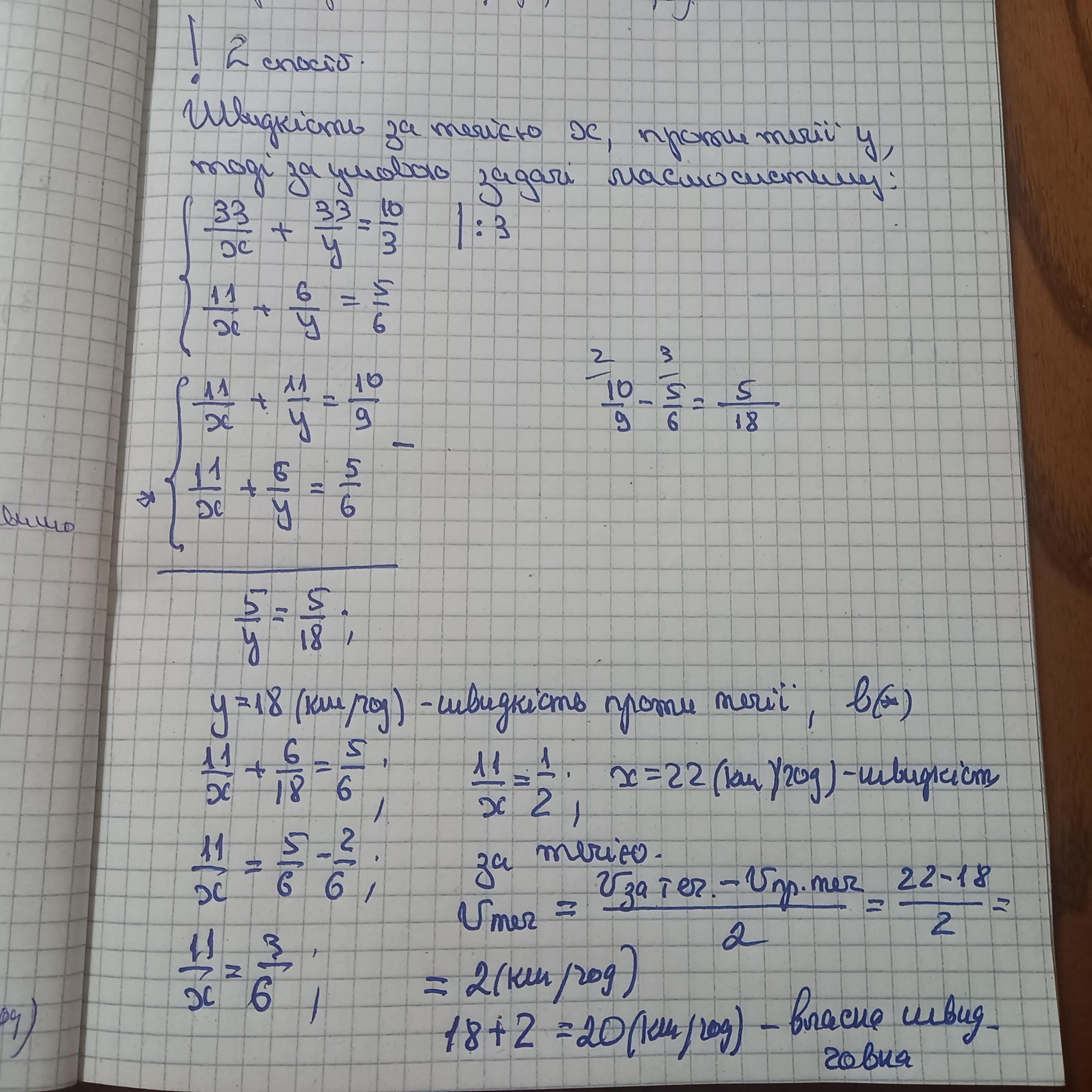 2. Моторний човен проплив 33 км за течією річки і повер- нув назад за 3 год 20 хв. Знайдіть власну швидкість човна і швидкість течії річки, якщо відомо, що 11 км за течією і 6 км проти течії вiн долає за 50 хв.