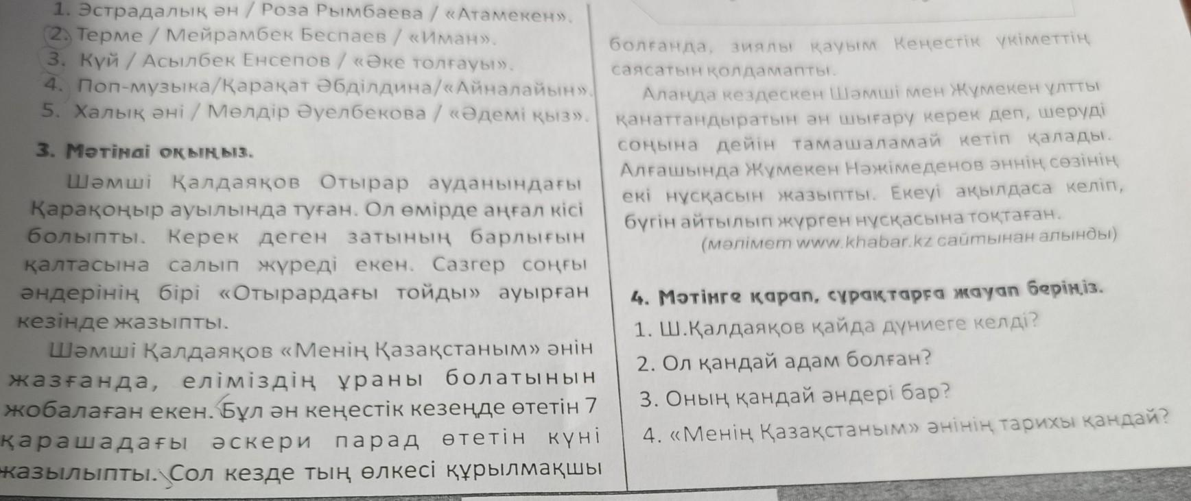 4. Мәтінге қарап, сұрақтарға жауап беріңіз. 1. Ш.Қалдаяқов кайда дүниеге келді? 2. Ол кандай адам болған? 3. Оның қандай әндері бар? 4. «Менің Қазақстаным» әнінің тарихы қандай?
