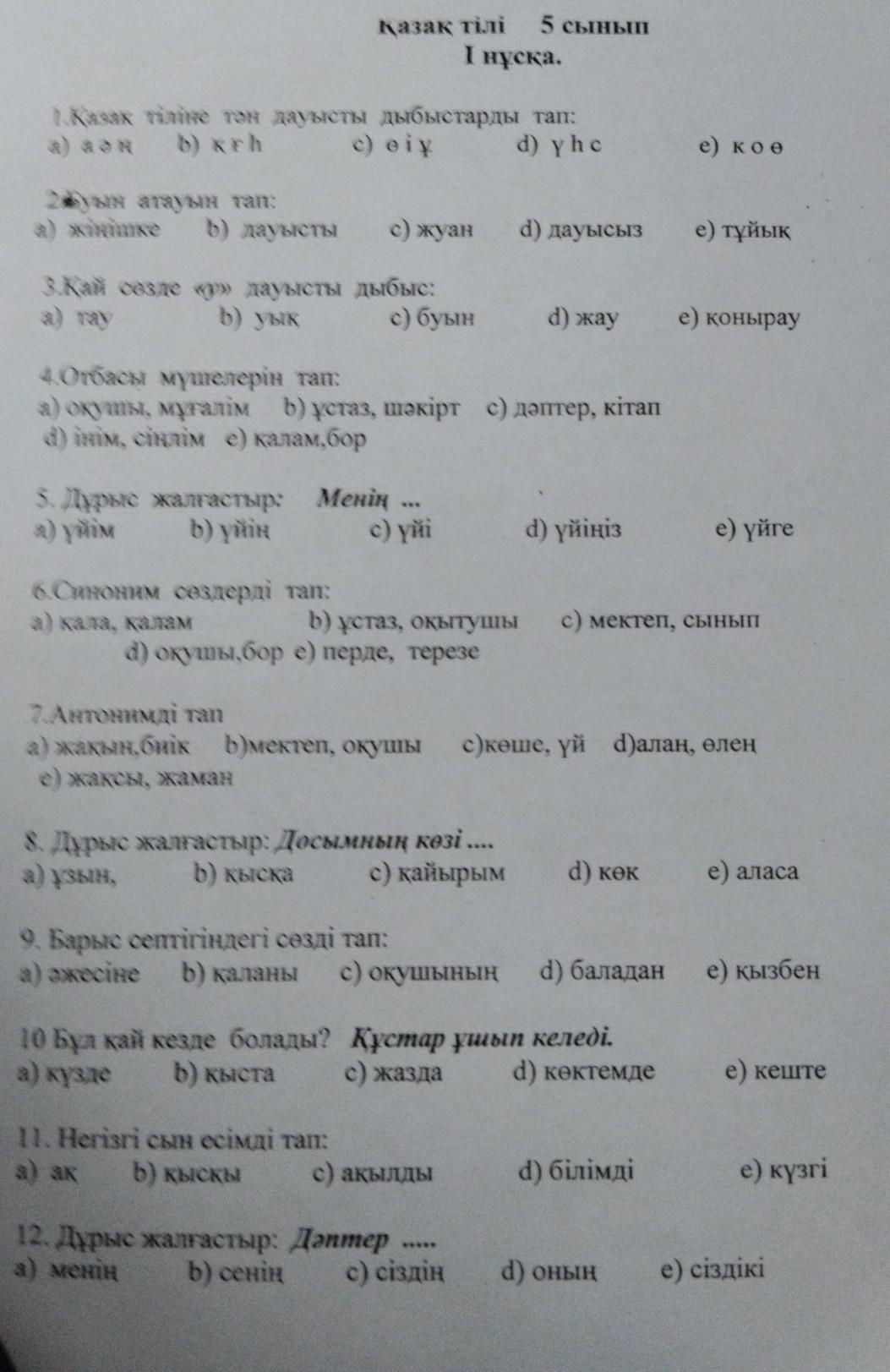 1.Қазақ тіліне тән дауысты дыбыстарды тап: а) аән b) Krh c) oiy d) yh c 2 уын атауын тап: а) жіңішке b) дауысты 3.Қай сөзде «у>> дауысты b) УЫҚ a) Tay Казак тілі 5 сынып I нуска. 4.Отбасы мүшелерін тап: а) окушы, мұғалім d) iнiм, сiнлiм е) калам,бор 5. Дұрыс жалғастыр: b) үйің а) уйiм c) жуан дыбыс: c) буын Менің ... d) дауысыз b) ұстаз, шәкiрт с) дәптер, кітап c) үйi d) жау d) үйiнiз e) кoe e) туйык e) конырау е) үйге