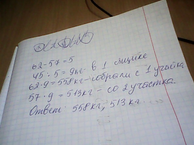 с одного участка собрали 62 ящика помидоров а с второй 57 таких же ящиков. со второй диянкы собрали на 45 кг меньше чем в первой. сколько кг помидоров собрали с каждого участка