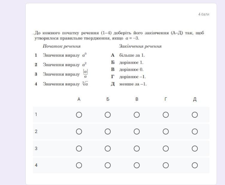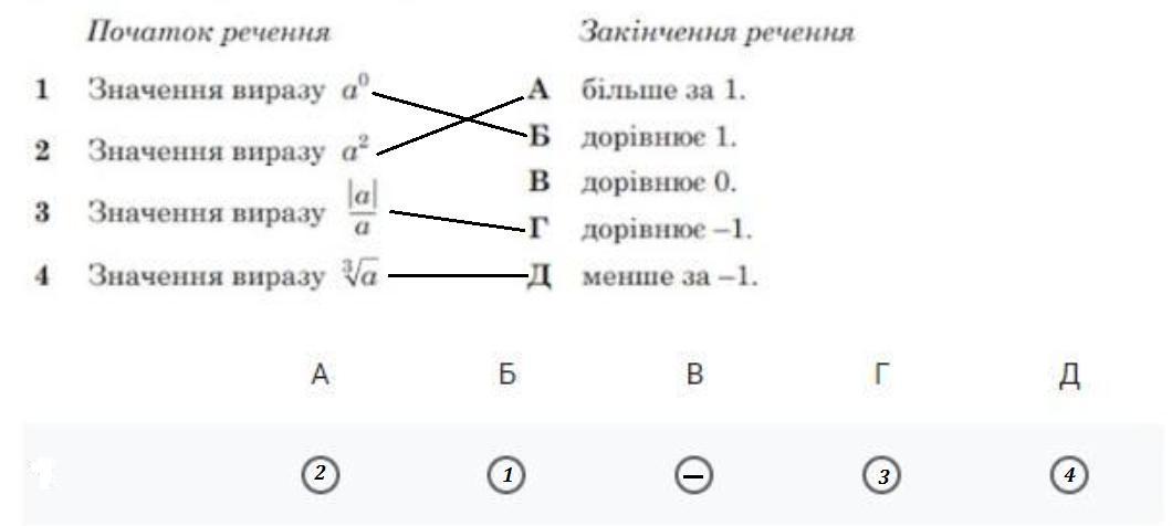 До кожного початку речення ( 1-4) доберіть його закінчення ( А- Д) так, щоб утворилося правильне твердження, якщо a = - 3
