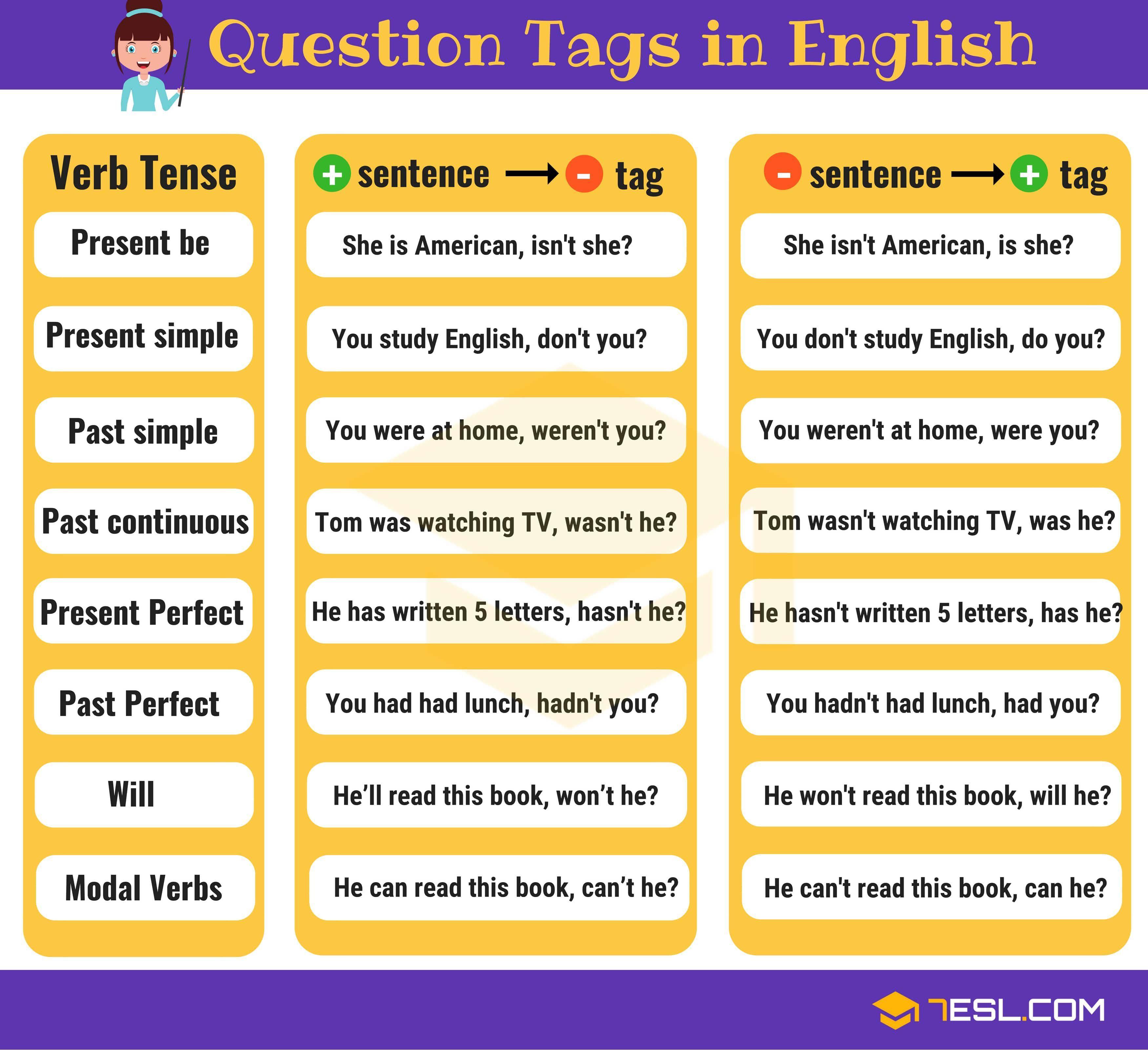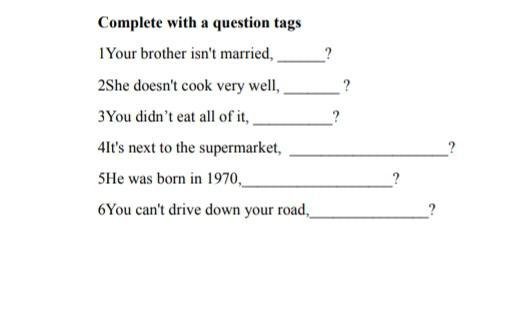 1 is he? 2 does she? 3 did you? 4 isn't it? 5 wasn't he? 6 can you?