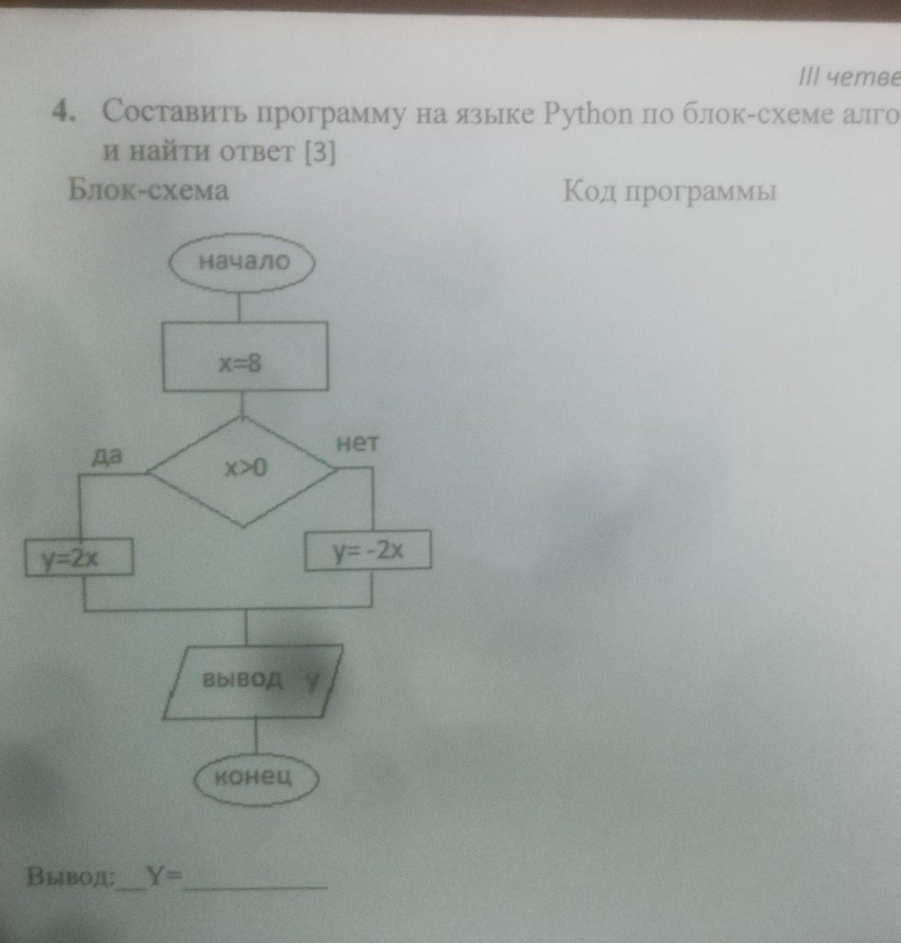III четверть, СOP1 4. Составить программу на языке Python по блок-схеме алгоритма и найти ответ [3] Блок-схема Код программы да y=2x Вывод: у начало x=8 x>0 вывод у конец нет у=-2x.
