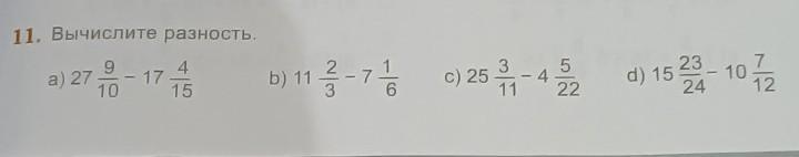 Вычислите разность. a)27 9/10-17 4/15. b)11 2/3-7 1/6. c)25 3/11-4 5/22. d)15 23/24-10 7/12