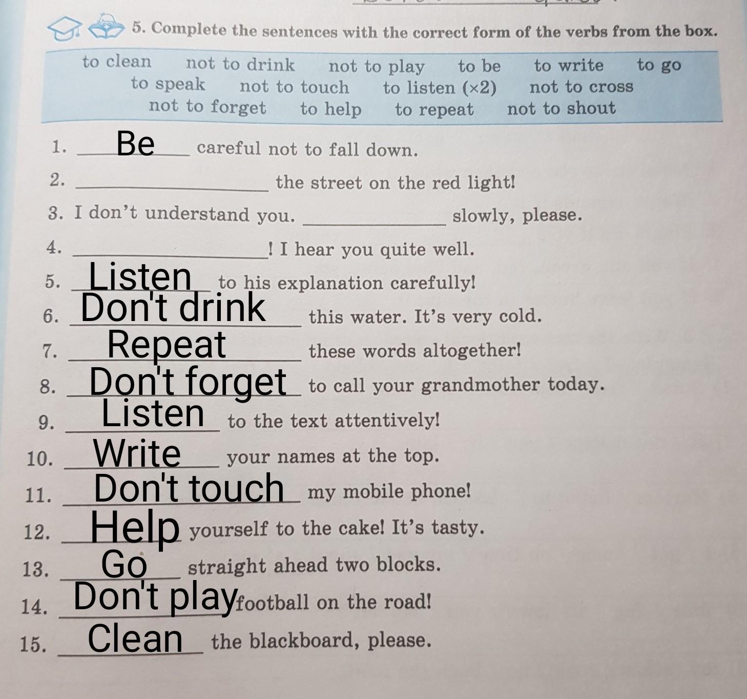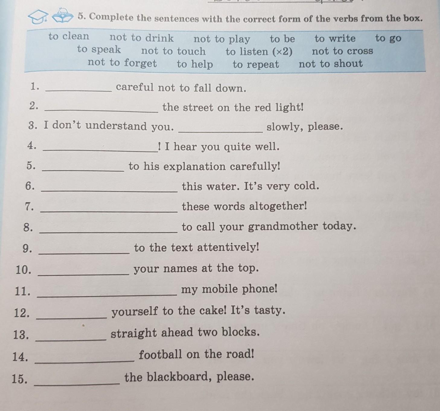 10. 11. 12. 13. 14. 15. 1. 6. 7. 8. 9. 5. Complete the sentences with the correct form of the verbs from the box. to go to clean not to drink not to play not to touch to help to speak not to forget 2. 3. I don't understand you. 4. 5. to be to listen (x2) to repeat careful not to fall down. the street on the red light! ! I hear you quite well. to his explanation carefully! to the text attentively! your names at the top. to write not to cross not to shout slowly, please. this water. It's very cold. these words altogether! to call your grandmother today. my mobile phone! yourself to the cake! It's tasty. straight ahead two blocks. football on the road! the blackboard, please.