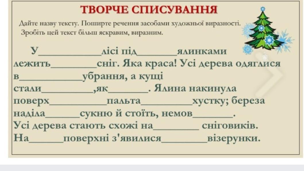 У темному лісі під густими ялинками лежить білий сніг.Яка краса!Усі дерева одяглися в біленьке вбрання,а кущі стали пухнастими,як котик.Ялинка накинула поверх зеленого пальта білу хустку; береза наділа білу сукню й стоїть,немов принцеса.Усі дерева стають схожі на величезних сніговиків.На білій поверхні з'явилися різноманітні візерунки.