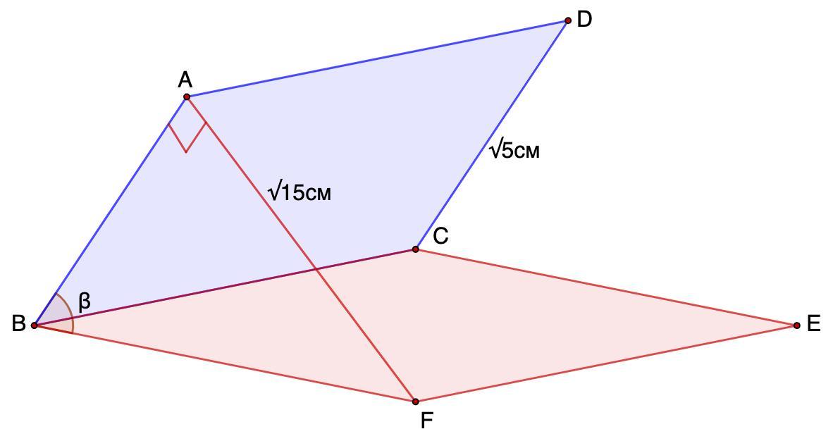 Прямоугольники ABCD и BCEF лежат в разных плоскостях (рис. 37.15), причем прямая AF перпендикулярна к плоскости ABC. Найдите двугранный угол, грани которого содержат данные прямоугольники, если AF = √15 см, CD = √5 см.