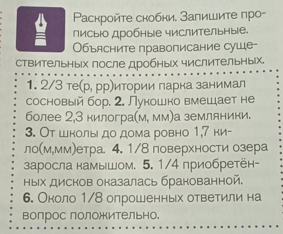 Раскройте скобки. Запишите прописью дробные числительные. Объясните правописание существительных после дробных числительных. 1. 2/3 те(р, рр)итории парка занимал сосновый бор. 2. Лукошко вмещает не более 2,3 килогра(м, мм)а земляники. 3. От школы до дома ровно 1,7 ки- ло(м,мм)етра. 4. 1/8 поверхности озера заросла камышом. 5. 1/4 приобретён- ных дисков оказалась бракованной. 6. Около 1/8 опрошенных ответили на вопрос положительно.
