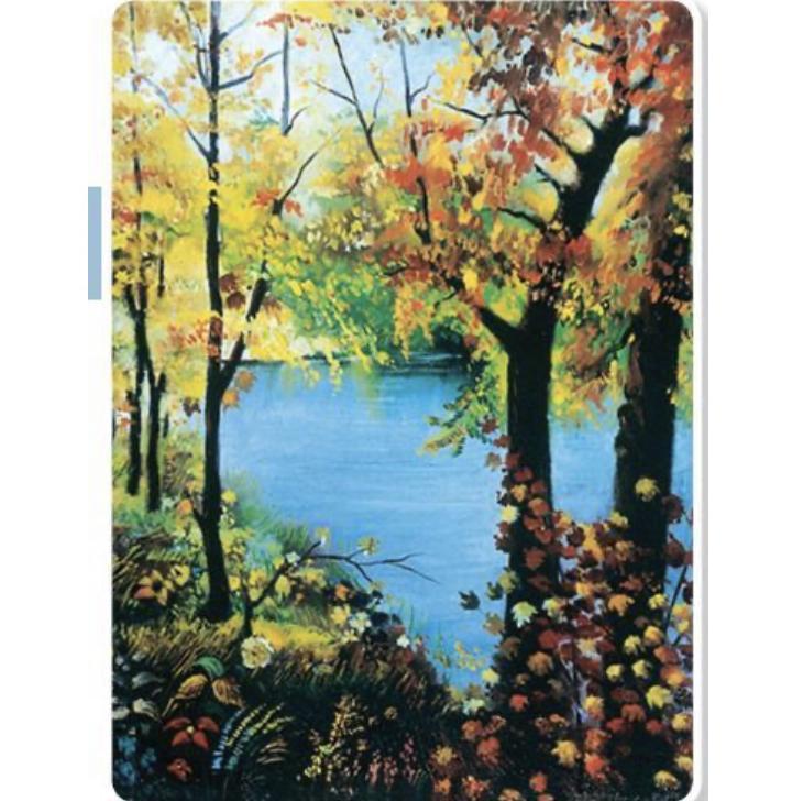 За деревьями, в центре картины, голубизна озера. По нему идет легкая рябь от ветерка и проплывают отражения облаков. Дальний план картины еще зелен. Там деревья макают свои гибкие ветви в воду, словно остужая их после летнего зноя.