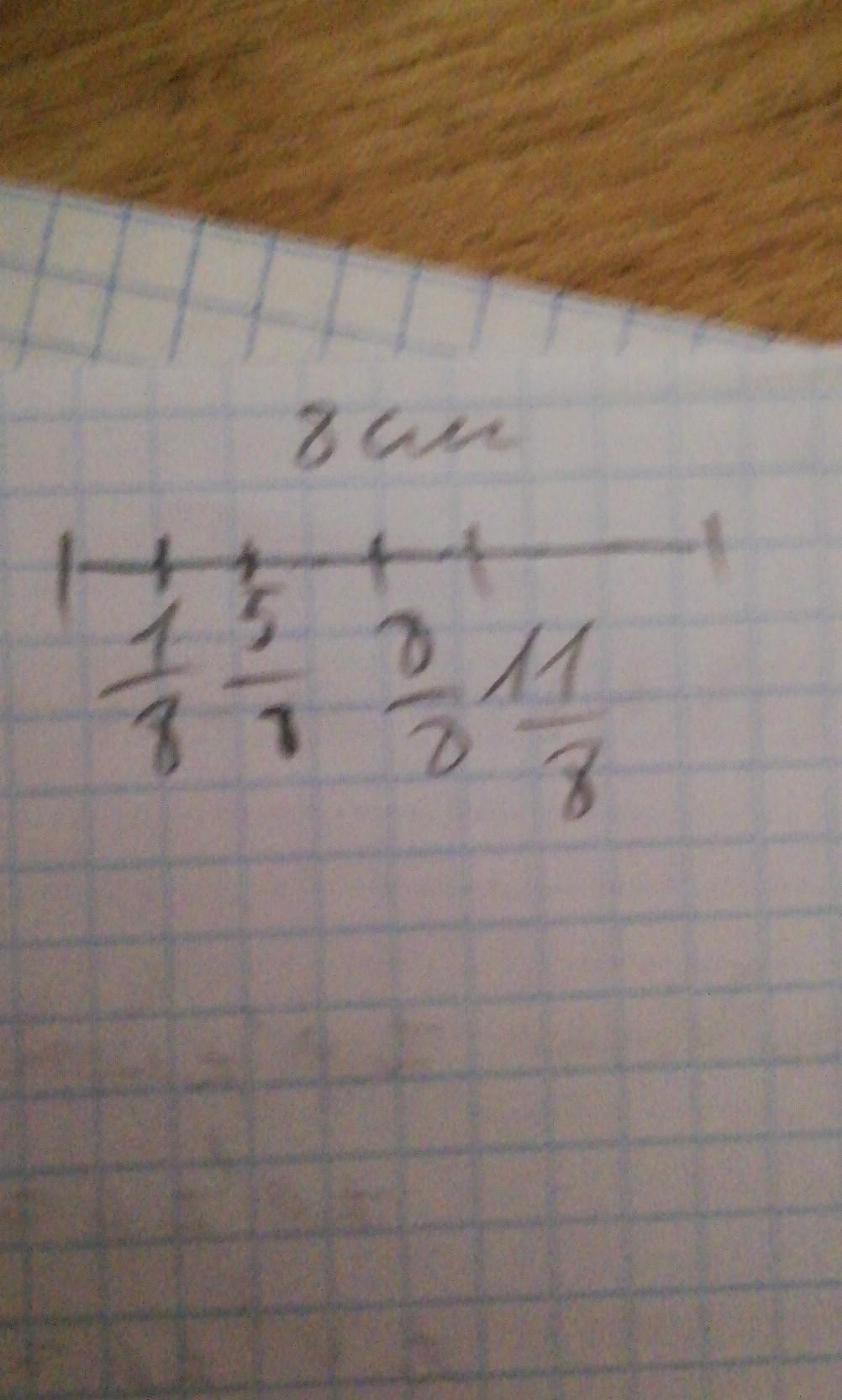 Накресли координатний промінь, узявши за одиничний відрізок 8 клітинок. Познач на ньому числа 5/8, 1/8, 8/8, 11/8