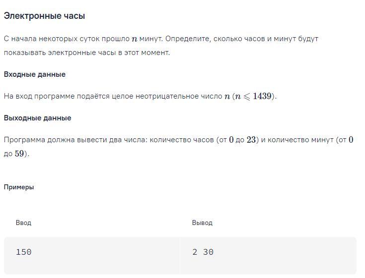 С начала некоторых суток прошло n минут. Определите, сколько часов и минут будут показывать электронные часы в этот момент.
