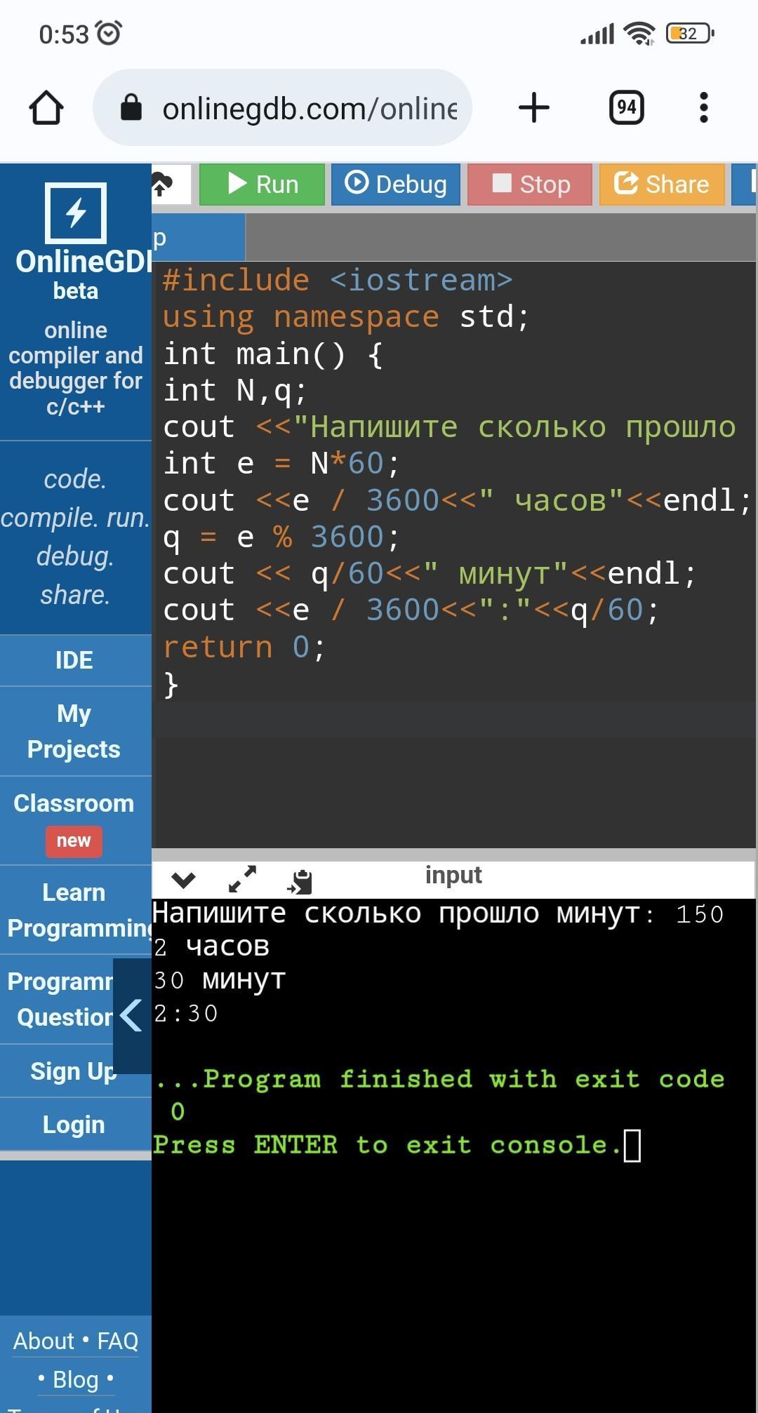 cout <<"Напишите сколько прошло минут: ";cin >> N;