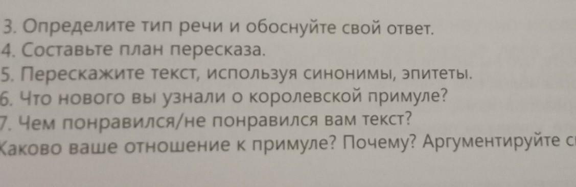 3. Определите тип речи и обоснуйте свой ответ. 4. Составьте план пересказа 5. Перескажите текст, используя синонимы, эпитеты 6. Что нового вы узнали о королевской примуле? 7. Чем понравился/не понравился вам текст? Каково ваше отношение к примуле? Почему? Аргументируйте своё мнение.