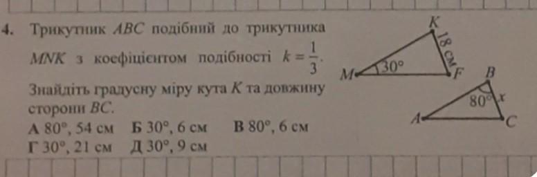 Ответ: кут К = 80°, так як трикутники подібні, сторона ВС = 18÷3 = 6см