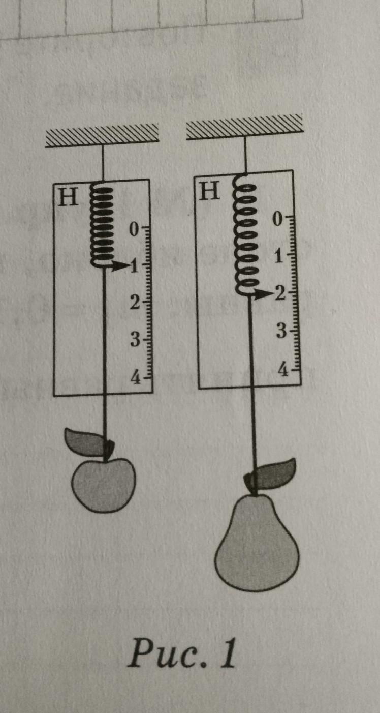 На вопросы. 1. К динамометрам подвешены яблоко и груша (рис. 1). На какой фрукт действует боль- шая сила тяжести? Во сколько раз? Чему равен вес груши и яблока?