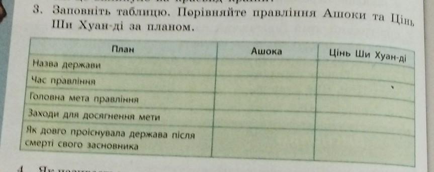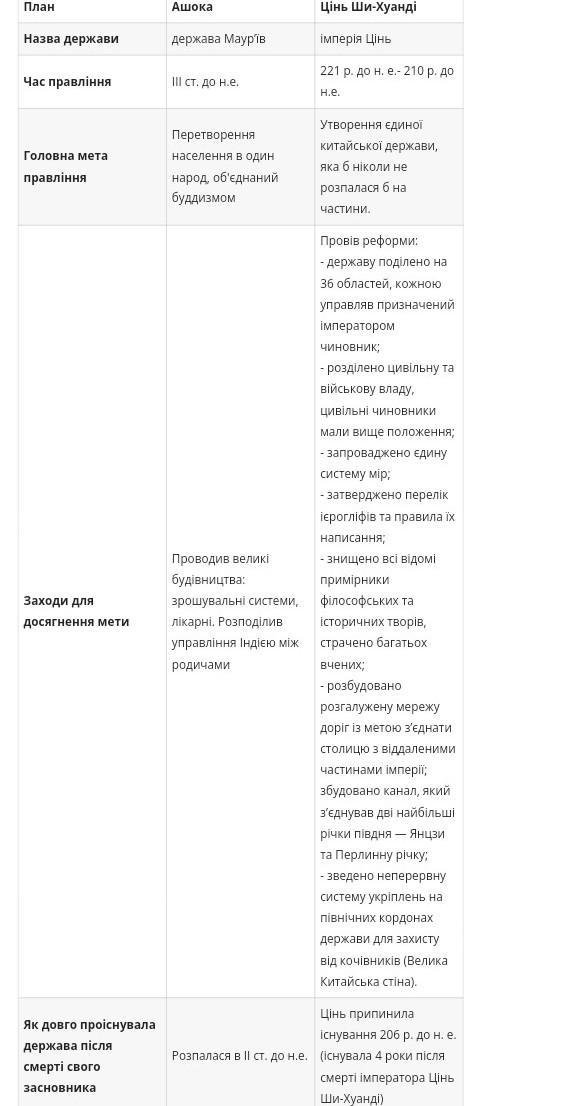 Заповніть таблицю. Порівняйте правління Ашоки та Цінь Ши Хуан-ді за планом.