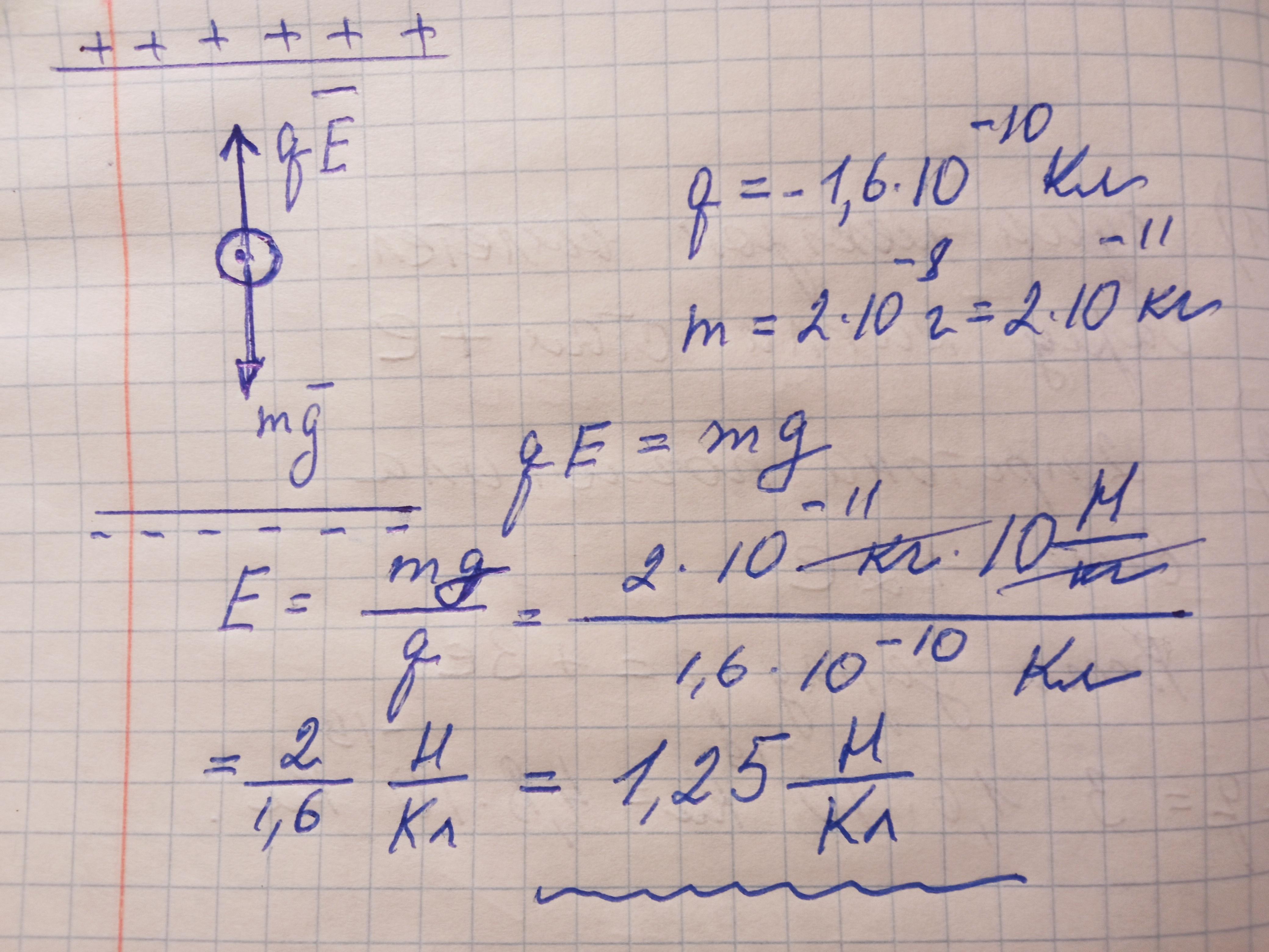 У вакуумі в однорідному полі знаходиться в спокої пилинка, маса якої 2*10-8 г, а заряд -1.6*10-10 Кл. Яка напруженість електричного поля?
