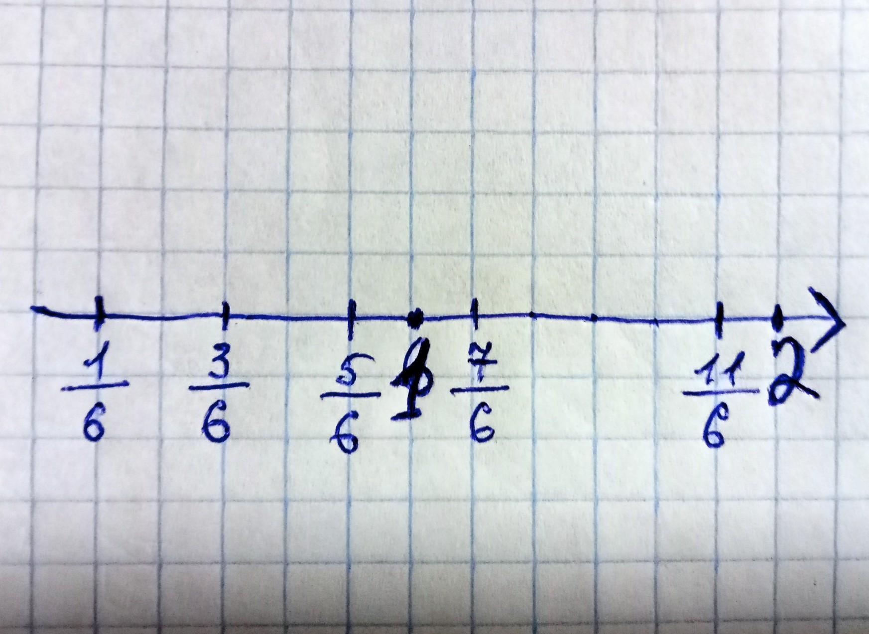 Накресліть координатний промінь, узявши за одинич- ний відрізок 6 клітинок зошита. Позначте на ньому точ- ки, що відповідають дробам 1/6, 3/6, 5/6, 7/6 11/6