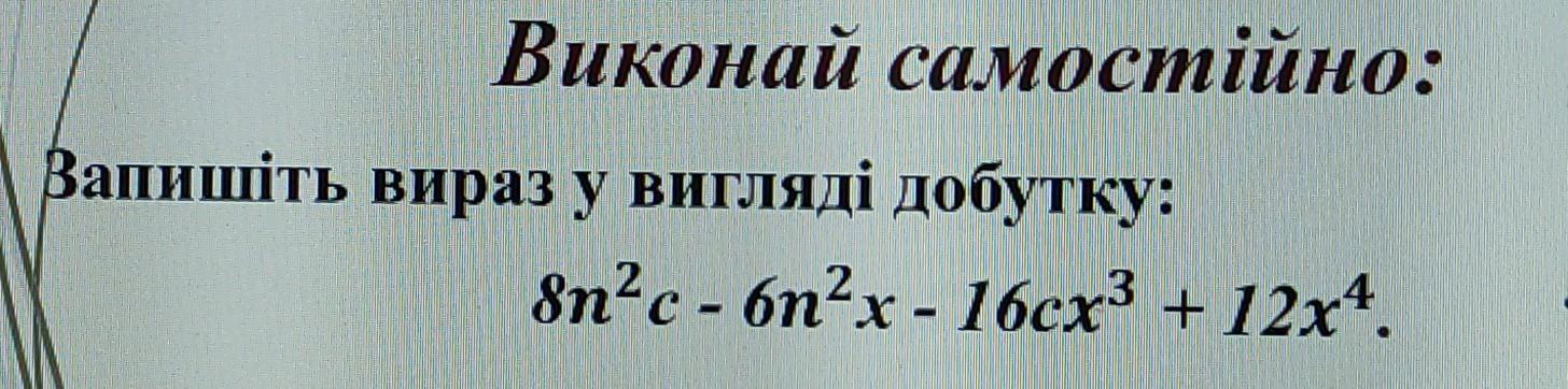 Наведений вираз можна переписати так: 8n²c - 6n²x - 26cx² + 12x⁴. Вираз можна ще більше спростити, поєднавши терміни, які мають однакову змінну та потужність. Це можна зробити, використовуючи властивість розподілу множення над додаванням, що дасть 8n²c - 6n²x - 26cx² + 12x⁴ = (8n²c - 6n²x) - (26cx² + 12x4).