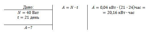 Джон забыл выключить свет в подвале. 40-ваттная лампочка "горела и потребляла электроэнергию" ровно три недели. Узнайте, сколько кВт/ч электроэнергии потребляла лампочка в течение этих 21 дней.