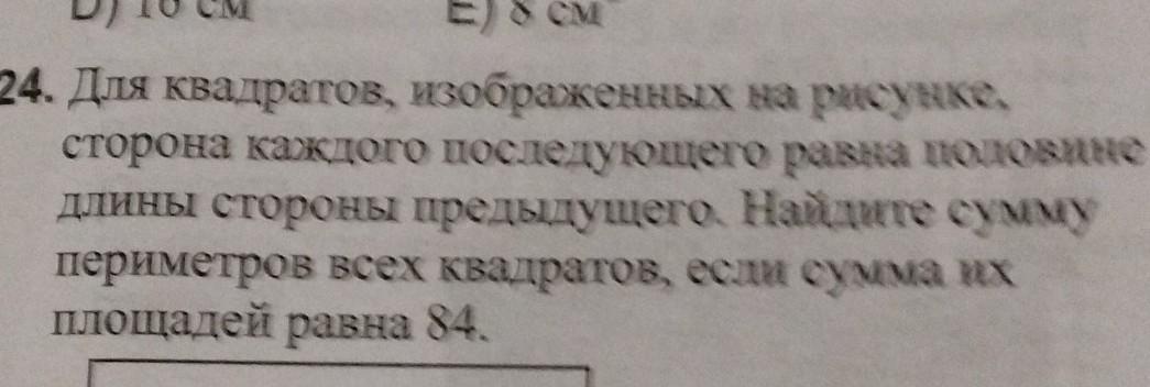 24. Для квадратов, изображенных на рисунке, равна половине сторона каждого последующего длины стороны предыдущего. Найдите сумму периметров всех квадратов, если сумма их площадей равна 84.