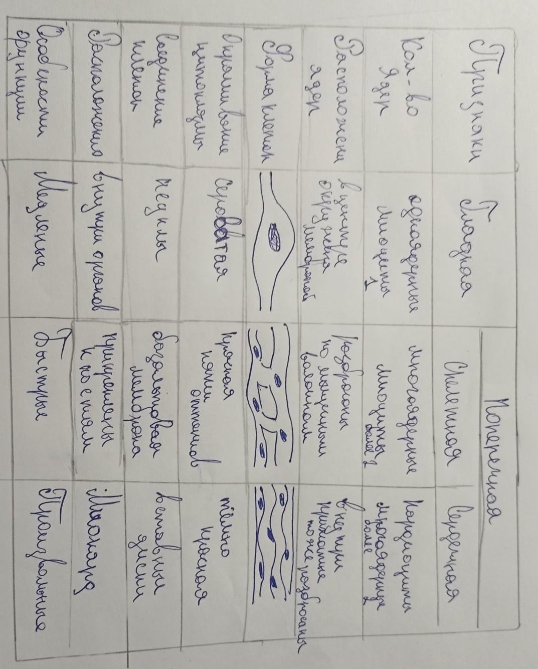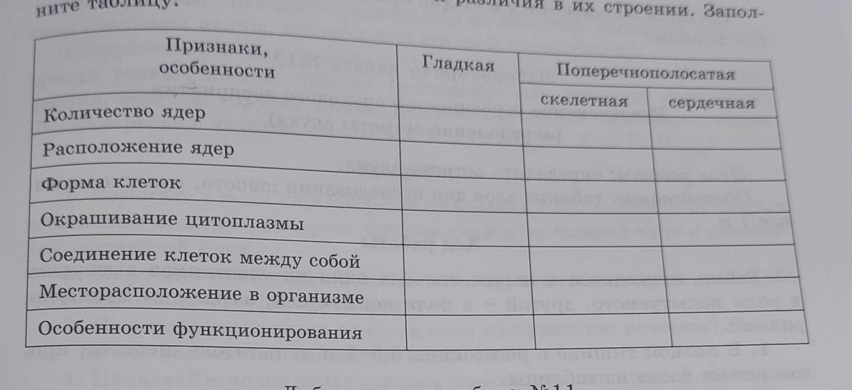 Признаки, особенности Количество ядер Расположение ядер Форма клеток Окрашивание цитоплазмы Соединение клеток между собой Месторасположение в организме Особенности функционирования щобор Гладкая части. в их строении. Запол- Поперечнополосатая скелетная сердечная