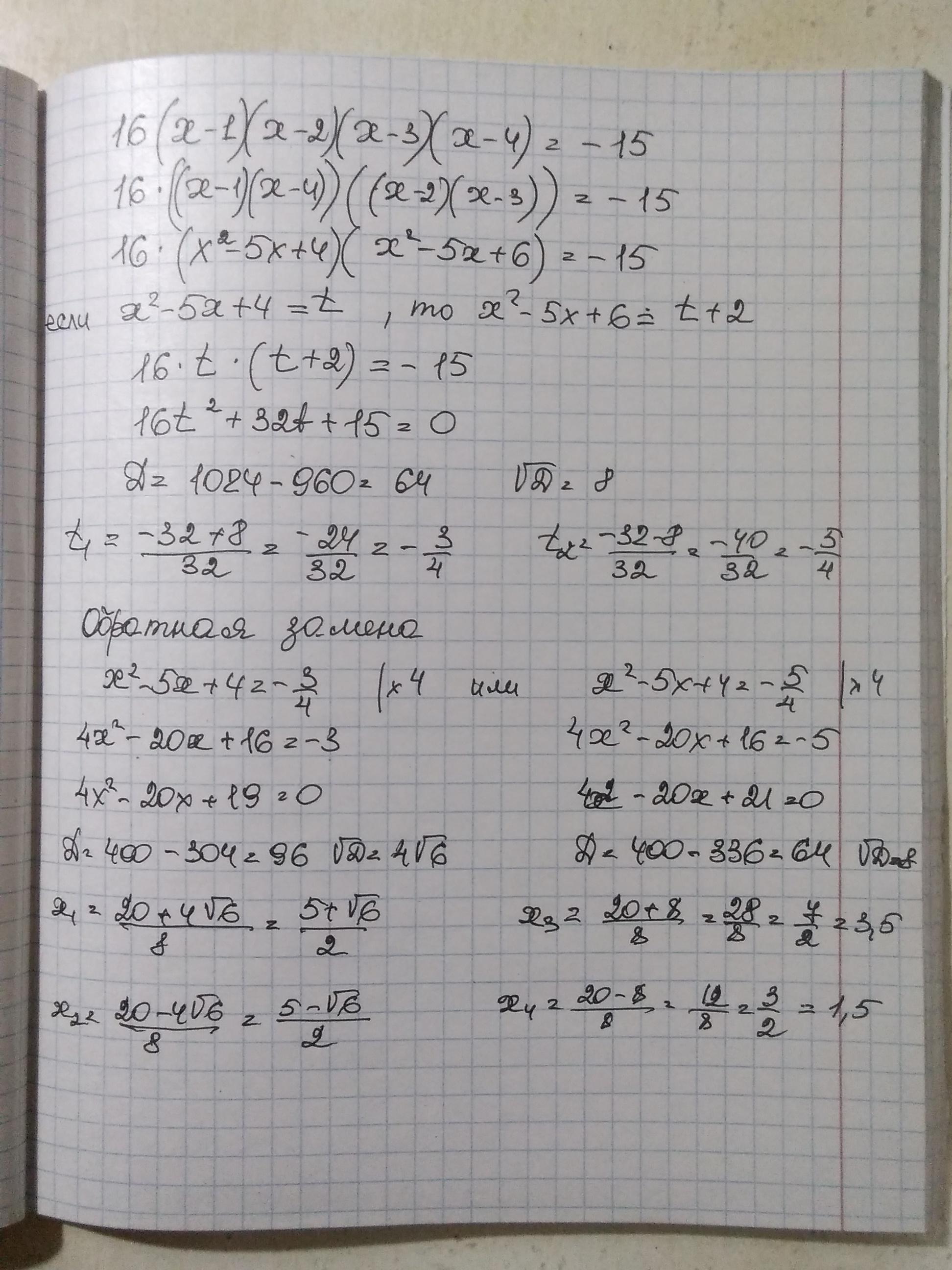 Ребят помогите пожалуйста 16(x-1)(x-2)(x-3)(x-4)=-15 с помощью замены переменных, с обьяснинями