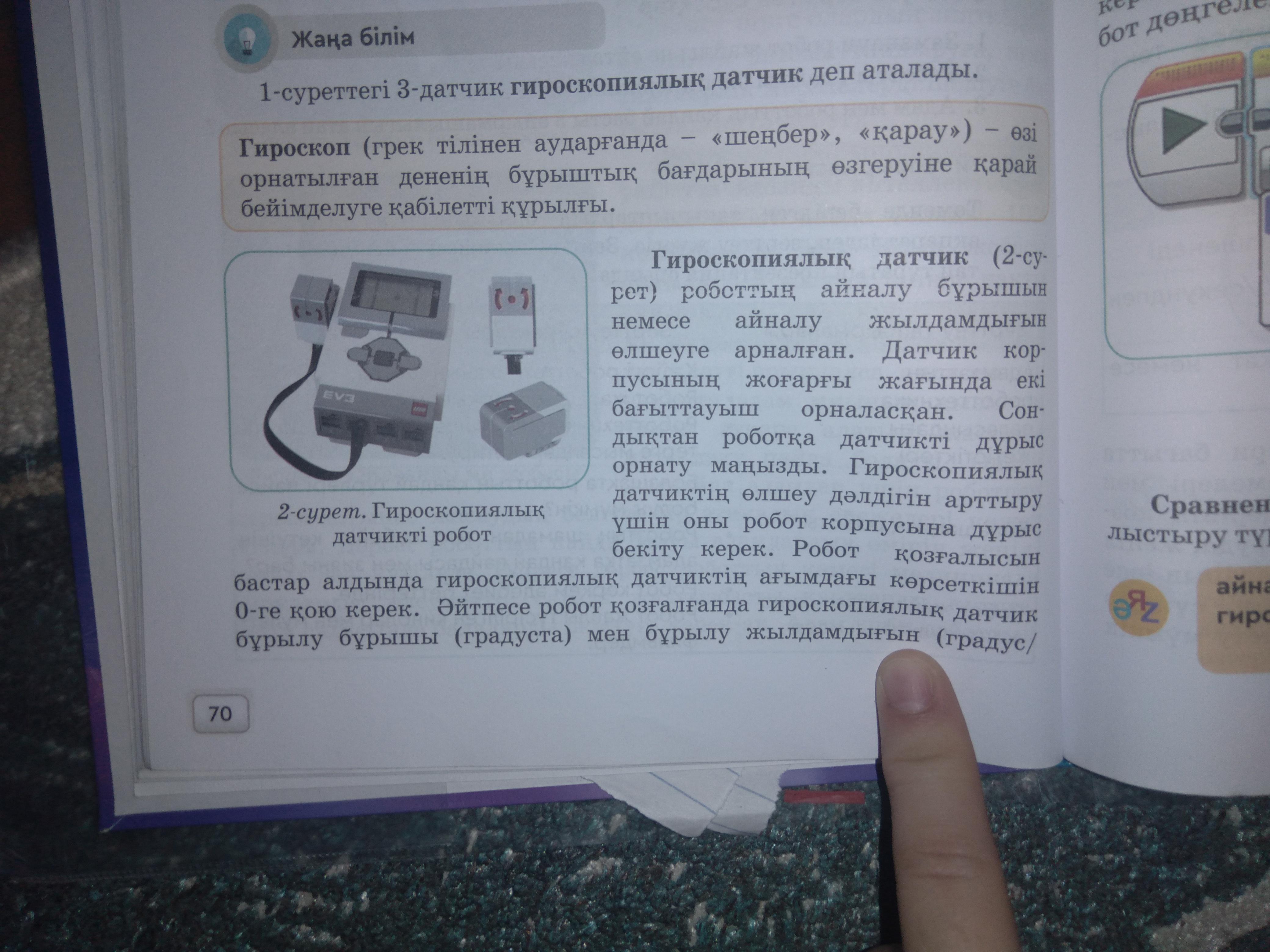 Гироскопиялық датчик – бұл бір ось бойынша айналмалы қозғалыста анықтайтын цифрлық датчик. Егерде сіз гироскопиялық датчикті, датчиктің қорабындағы бағыттауыштың бағытымен айналдыратын болсаңыз датчик айналу жылдамдығын секундтағы градуспен анықтайды. (Датчик өлшей алатын ең жоғары айналу жылдамдығы секундына 440 градусты құрайды ). Ары қарай сіз айналу жылдамдымдығын роботтың қандай да бір бөлшегі бұрылса немесе робот құласа анықтау үшін қолдана аласыз.