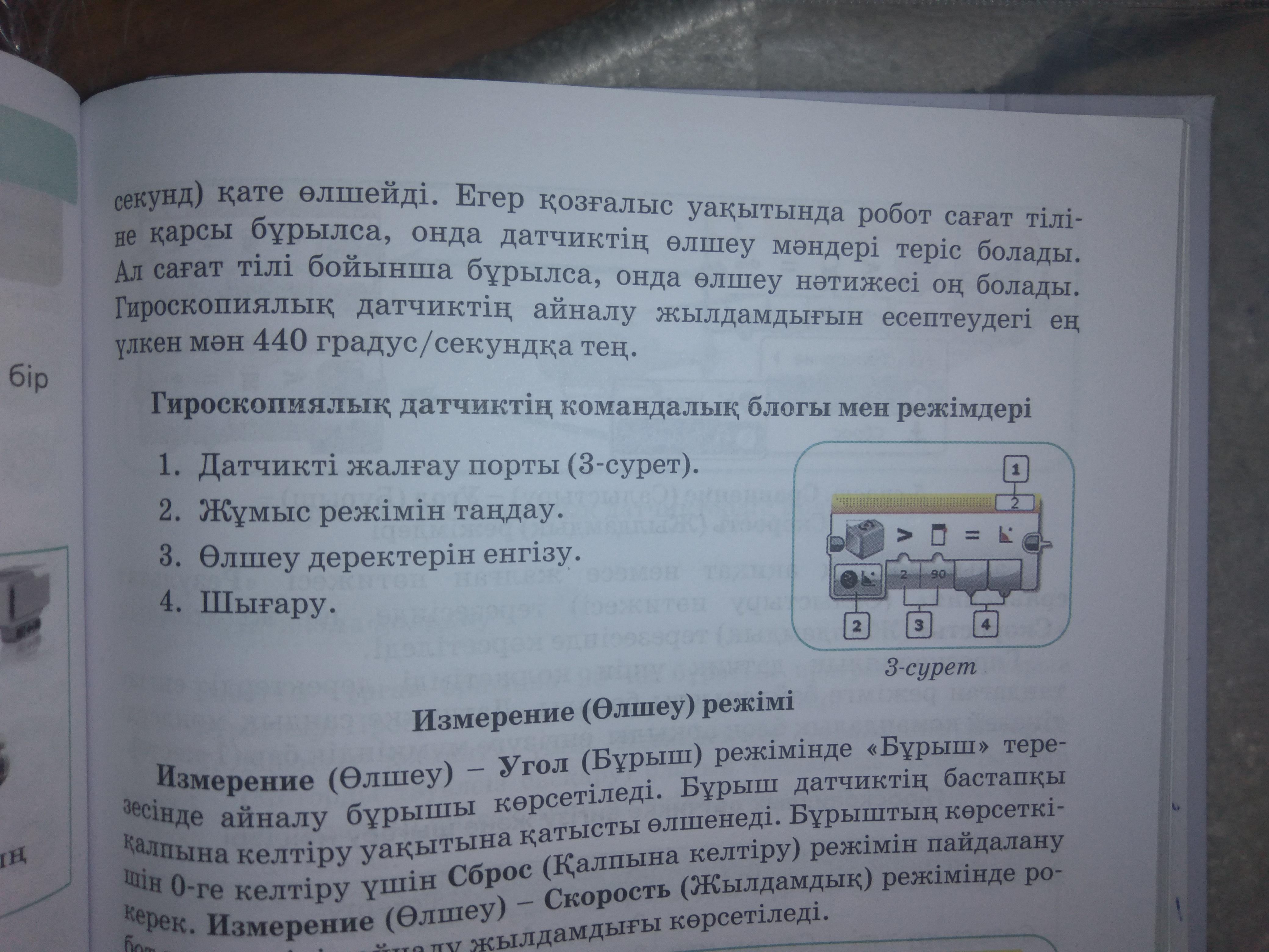 2 порт бойынша гироскопиялық датчикті түзу қара біріктіретін кабельдің көмегімен EV3 модуліне қосыңыз. Қосу барысында датчик қозғалыссыз болуы тиіс. EV3 модулінің экранында қосымша көрініс порты 0 мәнін 2-ші сол жақтағы кішкентай терезенің астында 2-ші порттың енгізу мәні көрінеді. Датчиктің қозғалыссыз қалпын сақтай отырып экранды бірнеше секунд бақыланыз. Онда бұрынғыша 2-ші портқа арналған 0 гироскопиялық дачикпен көрсетілуі тиіс. Егер де қосылу барысында дачикте 0 керсетілмесе, датчикті өшіріп процедураны қайталаңыз.